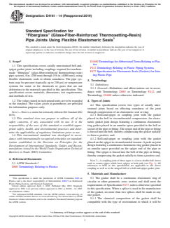 Keywords: ASTM pipe joint standard, fiberglass pipe, glass fiber reinforced, thermosetting resin, elastomeric gasket, bell-and-spigot joint, flexible seal, hydrostatic test, piping systems, standard specification.