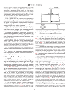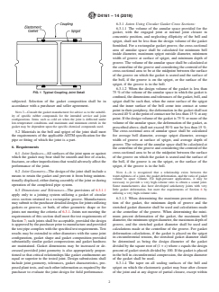 ABSTRACT This specification covers axially unrestrained bell-and-spigot gasket joints including couplings required for machine-made "fiberglass" (glass-fiber-reinforced thermosetting-resin) pipe systems, 8 in. (200 mm) through 144 in. (3700 mm), using flexible elastomeric seals to obtain soundness. The pipe systems may be pressure or nonpressure systems for water or for chemicals or gases that are not deleterious to the materials specified in this specification. The gasket shall be a continuous elastomeric ring of circular or other geometric cross section and shall meet the prescribed specifications. The gasket shall be subject to vacuum or external pressure test and shear loading test. SCOPE 1.1 This specification covers axially unrestrained bell-and-spigot gasket joints including couplings required for machine-made “fiberglass” (glass-fiber-reinforced thermosetting-resin) pipe systems, 8 in. (200 mm) through 156 in. (4000 mm), using flexible elastomeric seals to obtain soundness. The pipe systems may be pressure (typically up to 250 psi) or nonpressure systems for water or for chemicals or gases that are not deleterious to the materials specified in this specification. This specification covers materials, dimensions, test requirements, and methods of test. 1.2 The values stated in inch-pound units are to be regarded as the standard. The values given in parentheses are provided for information purposes only. Note 1: There is a similar but technically different ISO Standard (ISO 8639). 1.3 This standard does not purport to address all of the safety concerns, if any, associated with its use. It is the responsibility of the user of this standard to establish appropriate safety, health, and environmental practices and determine the applicability of regulatory limitations prior to use. 1.4 This international standard was developed in accordance with internationally recognized principles on standardization established in the Decision on Principles for the Development of International Standards, Guides and Recommendations issued by the World Trade Organization Technical Barriers to Trade (TBT) Committee.