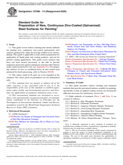 ASTM D7396-14(2020) is a guide published by ASTM International. Its full title is "Standard Guide for Preparation of New, Continuous Zinc-Coated (Galvanized) Steel Surfaces for Painting". This standard covers: SIGNIFICANCE AND USE 4.1 This guide describes procedures that can be used to prepare new zinc-coated surfaces for painting and improve the bond of paint to the zinc surface. SCOPE 1.1 This guide covers surface cleaning and various methods for treating new, continuous zinc-coated (galvanized) steel surfaces produced by either the hot-dip method or by electroplating. This guide is applicable to only surface preparation for application of liquid paint and coating products, and not for powder coating applications. This guide covers surfaces that have not been treated previously at the mill to provide temporary protection against staining by moisture other than by easily removed protective oils (see Appendix X1). For preparing surfaces of new or weathered items of zinc-coated steel produced by batch processing, refer to Practice D6386. 1.2 The values stated in SI units are to be regarded as the standard. The values given in parentheses are for information only. 1.3 This standard does not purport to address all of the safety concerns, if any, associated with its use. It is the responsibility of the user of this standard to establish appropriate safety, health, and environmental practices and determine the applicability of regulatory limitations prior to use. 1.4 This international standard was developed in accordance with internationally recognized principles on standardization established in the Decision on Principles for the Development of International Standards, Guides and Recommendations issued by the World Trade Organization Technical Barriers to Trade (TBT) Committee.