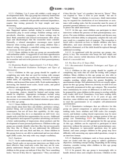 SIGNIFICANCE AND USE 4.1 It is necessary and useful to test with children because they represent the real end-users for many products. Some products are developed specifically for children, and some are dual-purpose products that are intended for adults and children. Examples include: baby foods, diapers, ready-to-eat cereal, juices, food or lunch kits, candy, toys, vitamins and other pharmaceuticals, music and videos, interactive learning tools, and packaging. 4.2 Children have influence over adults' purchase decisions and are responsible for many or some of their own purchase decisions. 4.3 Creating a product for children requires input from children because their wants and needs differ from those of adults. For example, they may differ from adults in preferences or sensory acuity, or both, for sweetness, saltiness, carbonation, and texture. It is impossible to predict the nature of these differences without actual input from the intended target audience. SCOPE 1.1 This guide provides a framework for understanding the issues relating to conducting sensory and market research studies with children. It recommends and provides examples for developing ethical, safe, and valid testing methods. It focuses specifically on the concerns relevant to testing with children from birth through preadolescence. The guide assumes that minors older than 15 years of age are generally capable of performing sensory tests like adults, and therefore, all standard procedures used with adult subjects apply. The one exception, however, is legal consent where parental/legal guardian permission should be obtained for anyone under 18 years of age. 1.2 This guide will take into account the wide range of children's physical, emotional, and cognitive levels of development. It will prove useful for developing tasks that are understandable to children. It recommends alternative modes for children to communicate their opinions or perceptions back to the researcher, such as appropriate scales and measures. 1.3 The ethical standard presented in this document should be viewed as a minimum requirement for testing with minors. The safety and protection of children as respondents, as well as an attitude of respect for the value of their input should be of primary concern to the researcher. 1.4 The considerations raised in this document may also be useful when testing with the elderly or with adults who have developmental handicaps. 1.5 This document is not intended to be a complete description of reliable sensory testing techniques and methodologies. It focuses instead on special considerations for the specific application of sensory techniques when testing with children. It assumes knowledge of basic sensory and statistical analysis techniques. 1.6 This international standard was developed in accordance with internationally recognized principles on standardization established in the Decision on Principles for the Development of International Standards, Guides and Recommendations issued by the World Trade Organization Technical Barriers to Trade (TBT) Committee.