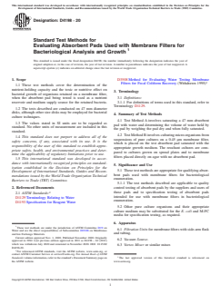 Keywords: ASTM D4198-20, absorbent pads, membrane filters, bacteriological analysis, microbiological water testing, bacterial enumeration, nutrient-holding capacity, laboratory quality control, water quality standards, environmental microbiology, international standard.