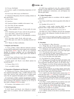 ASTM D4198-20 is a standard published by ASTM International. Its full title is "Standard Test Methods for Evaluating Absorbent Pads Used with Membrane Filters for Bacteriological Analysis and Growth ". This standard covers: SIGNIFICANCE AND USE 5.1 These test methods are appropriate for qualifying absorbent pads used with membrane filters for bacteriological enumeration. 5.1.1 The test methods described are applicable to quality control testing of absorbent pads by the suppliers and users of these pads and to specification testing of absorbent pads intended for use with membrane filters in bacteriological enumeration. 5.2 Other pure culture organisms and their appropriate culture medium may be substituted for the E. coli and M-FC media for specification testing, as required. SCOPE 1.1 These test methods cover the determination of the nutrient-holding capacity and the toxic or nutritive effect on bacterial growth of organisms retained on a membrane filter, when the absorbent pad being tested is used as a nutrient reservoir and medium supply source for the retained bacteria. 1.2 The tests described are conducted on 47 mm diameter disks, although other size disks may be employed for bacterial culture techniques. 1.3 The values stated in SI units are to be regarded as standard. No other units of measurement are included in this standard. 1.4 This standard does not purport to address all of the safety concerns, if any, associated with its use. It is the responsibility of the user of this standard to establish appropriate safety, health, and environmental practices and determine the applicability of regulatory limitations prior to use. 1.5 This international standard was developed in accordance with internationally recognized principles on standardization established in the Decision on Principles for the Development of International Standards, Guides and Recommendations issued by the World Trade Organization Technical Barriers to Trade (TBT) Committee.