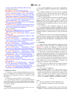 SIGNIFICANCE AND USE 3.1 Definitions—Terms and related definitions given in Section 4 are intended for use uniformly and consistently in all building and environmental acoustic test standards in which they appear. 3.2 Definitions of Terms Specific to Each Standard: 3.2.1 As indicated in Section 4, terms and their definitions are intended to provide a precise understanding and interpretation of the building and environmental acoustic test standards in which they appear. 3.2.2 A specific definition of a given term is applicable to the standard or standards in which the term is described and used. 3.2.3 Different definitions of the same term are acceptable provided each one is consistent with and is not in conflict with the standard definition for the same term, that is, the general concept the term describes. 3.2.4 If a standard under the jurisdiction of ASTM Committee E33 specially defines a term, i.e. provides a definition different in any way from what is given in Section 4 of Terminology C634, that standard shall list the term and its description under the subheading, Definitions of Terms Specific to This Standard. 3.2.4.1 Discussion—The mandatory language of section 3.2.4 is consistent with the mandatory language from §E2 of Form and Style for ASTM Standards (April 2020) and with the ASTM Committee E33 bylaws in place when this standard was published; it reflects a situation that exists, it does not prescribe anything. 3.3 Definitions for some terms associated with building and environmental acoustic issues and not included in Terminology C634 are found in ISO/TR 25417 or IEEE P260.4. When discrepancies exist, the definition in Terminology C634 shall prevail. SCOPE 1.1 This terminology covers terms, related definitions, and descriptions of terms used or likely to be used in building and environmental acoustics standards. Definitions of terms are special-purpose definitions that are consistent with the standard definitions but are written to ensure that a specific building and environmental acoustics standard is properly understood and precisely interpreted. The primary focus of this document is upon terms, definitions and descriptions found within standards under the jurisdiction of ASTM Committee E33; however, terms, definitions and descriptions that are of general interest to the field of acoustics are also included. 1.2 This building and environmental acoustics standard cannot be used to provide quantitative measures. 1.3 This standard does not purport to address all of the safety concerns, if any, associated with its use. It is the responsibility of the user of this standard to establish appropriate safety, health, and environmental practices and determine the applicability of regulatory limitations prior to use. 1.4 This international standard was developed in accordance with internationally recognized principles on standardization established in the Decision on Principles for the Development of International Standards, Guides and Recommendations issued by the World Trade Organization Technical Barriers to Trade (TBT) Committee.