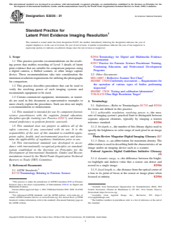 ASTM E3235-21 is a standard published by ASTM International. Its full title is "Standard Practice for Latent Print Evidence Imaging Resolution". This standard covers: SIGNIFICANCE AND USE 5.1 The procedure described in this document is in accordance with current SWGFAST guidelines (6), as well as National Institute of Standards and Technology (NIST) standard (7), which specify 1000 pixels per inch (ppi) at 1:1 as the minimum scanning resolution for latent print evidence. This standard appears primarily to be historical and directed towards scanners, rather than cameras, though recent studies suggest that it is suitable for capturing Level 3 detail (8). 5.2 While the 1000 ppi resolution standard permits the capture of level three detail in latent prints, it does not mean that any image recorded at a lower resolution would necessarily be of no value for comparison purposes. Such an image could have captured level two details sufficiently for comparison. However, there are some latent print impressions that are so degraded or contain such limited quantity of information that at least 1000 ppi resolution is required to conduct an accurate examination. Some automated fingerprint identification systems require 1000 ppi for submission purposes. The relationship between machine (optical) resolution and achievable resolution (sometimes called resolving power) can vary greatly by manufacturer (8). SCOPE 1.1 This practice provides recommendations on the resolving power that enables recording of Level 3 details of latent print evidence that are suitable for comparison purposes using a digital camera, a flatbed scanner, or other image capture device. These recommendations take into consideration the minimum resolution requirements for utilizing the photographs for comparison. 1.2 This practice describes procedures that can be used to verify the resolving power of such imaging systems and recommends equipment to be used. 1.3 Certain commercial equipment, instruments, or materials are used in this document as representative examples to more clearly explain the procedures. Such use does not imply a recommendation or endorsement. 1.4 This standard is intended for use by competent forensic science practitioners with the requisite formal education, discipline-specific training (see Practice E2917), and demonstrated proficiency to perform forensic casework. 1.5 This standard does not purport to address all of the safety concerns, if any, associated with its use. It is the responsibility of the user of this standard to establish appropriate safety, health, and environmental practices and determine the applicability of regulatory limitations prior to use. 1.6 This international standard was developed in accordance with internationally recognized principles on standardization established in the Decision on Principles for the Development of International Standards, Guides and Recommendations issued by the World Trade Organization Technical Barriers to Trade (TBT) Committee.