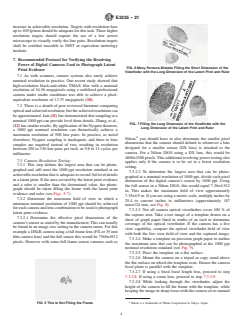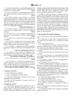 SIGNIFICANCE AND USE 5.1 The procedure described in this document is in accordance with current SWGFAST guidelines (6), as well as National Institute of Standards and Technology (NIST) standard (7), which specify 1000 pixels per inch (ppi) at 1:1 as the minimum scanning resolution for latent print evidence. This standard appears primarily to be historical and directed towards scanners, rather than cameras, though recent studies suggest that it is suitable for capturing Level 3 detail (8). 5.2 While the 1000 ppi resolution standard permits the capture of level three detail in latent prints, it does not mean that any image recorded at a lower resolution would necessarily be of no value for comparison purposes. Such an image could have captured level two details sufficiently for comparison. However, there are some latent print impressions that are so degraded or contain such limited quantity of information that at least 1000 ppi resolution is required to conduct an accurate examination. Some automated fingerprint identification systems require 1000 ppi for submission purposes. The relationship between machine (optical) resolution and achievable resolution (sometimes called resolving power) can vary greatly by manufacturer (8). SCOPE 1.1 This practice provides recommendations on the resolving power that enables recording of Level 3 details of latent print evidence that are suitable for comparison purposes using a digital camera, a flatbed scanner, or other image capture device. These recommendations take into consideration the minimum resolution requirements for utilizing the photographs for comparison. 1.2 This practice describes procedures that can be used to verify the resolving power of such imaging systems and recommends equipment to be used. 1.3 Certain commercial equipment, instruments, or materials are used in this document as representative examples to more clearly explain the procedures. Such use does not imply a recommendation or endorsement. 1.4 This standard is intended for use by competent forensic science practitioners with the requisite formal education, discipline-specific training (see Practice E2917), and demonstrated proficiency to perform forensic casework. 1.5 This standard does not purport to address all of the safety concerns, if any, associated with its use. It is the responsibility of the user of this standard to establish appropriate safety, health, and environmental practices and determine the applicability of regulatory limitations prior to use. 1.6 This international standard was developed in accordance with internationally recognized principles on standardization established in the Decision on Principles for the Development of International Standards, Guides and Recommendations issued by the World Trade Organization Technical Barriers to Trade (TBT) Committee.