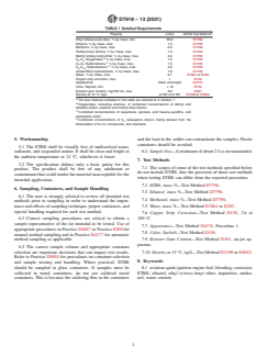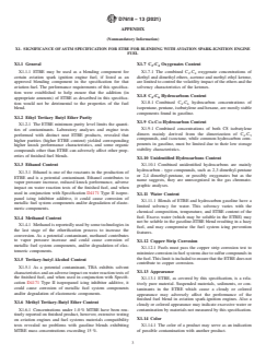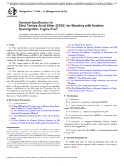 ASTM D7618-13(2021) is a technical specification published by ASTM International. Its full title is "Standard Specification for Ethyl Tertiary-Butyl Ether (ETBE) for Blending with Aviation Spark-Ignition Engine Fuel". This standard covers: ABSTRACT This specification covers requirements for fuel grade ethyl tertiary-butyl ether (ETBE) that may be used for blending with fuels for aviation spark-ignition engines where permissible. The requirements for ETBE that may be used for blending with fuels for aviation spark-ignition engines are given. The ETBE shall be visually free of undissolved water, sediment, and suspended matter that could render the material unacceptable for the intended application. SCOPE 1.1 This specification covers requirements for fuel grade ethyl tertiary-butyl ether (ETBE) that may be used for blending with fuels for aviation spark-ignition engines where permissible. Other ETBE grades available in the marketplace that do not comply with the requirements of this specification, are not suitable for blending with aviation fuels. 1.2 The values stated in SI units are to be regarded as standard. No other units of measurement are included in this standard. 1.3 This standard does not purport to address all of the safety concerns, if any, associated with its use. It is the responsibility of the user of this standard to establish appropriate safety, health, and environmental practices and determine the applicability of regulatory limitations prior to use. 1.4 This international standard was developed in accordance with internationally recognized principles on standardization established in the Decision on Principles for the Development of International Standards, Guides and Recommendations issued by the World Trade Organization Technical Barriers to Trade (TBT) Committee.