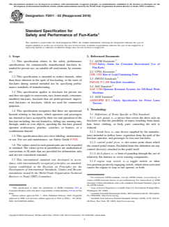 ASTM F2011-02(2018) is the internationally recognized standard specification for the safety and performance of commercially manufactured fun-karts intended for private, off-road use by consumers. Developed by ASTM International, this standard addresses the core features necessary to reduce hazards in fun-kart operation that are not inherent to the recreational activity itself. The standard outlines requirements for the design, structure, and operation of fun-karts, ensuring a baseline of safety and performance for users. It intentionally excludes fun-karts used for commercial purposes, race or concession karts, home-made, consumer-modified, pedal-powered, or unpowered karts. Labeling, maintenance, and use instructions are not covered by this document.
