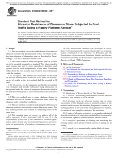 SIGNIFICANCE AND USE 5.1 This test method provides a means to quantify the abrasion resistance of dimension stone and may be related to end-use performance, or used to comparatively rank material performance, or both. The resistance of dimension stone to abrasion, as measured on a testing machine in the laboratory, is generally only one of several factors contributing to wear performance as experienced in the actual use of the material. Calculation of predicted life should not be based on specific abrasion data alone. 5.2 The resistance of dimension stone to abrasion may be affected by factors including test conditions; type of abradant; pressure between the specimen and abradant; mounting of the specimen; and type, kind, or amount of finishing materials. 5.3 Abrasion tests utilizing the rotary platform abraser may be subject to variation due to changes in the abradant during the course of specific tests. Depending on abradant type and test specimen, the abrading wheel surface may change (that is, become clogged) due to pick-up of finishing or other materials from test specimens. To reduce this variation, the abrading wheels may require resurfacing. SCOPE 1.1 This test method covers the establishment of an index of abrasion resistance by determination of loss of volume resulting from abrasion of dimension stone as described in Terminology C119 and is based on Guide G195. 1.2 The values stated in either inch-pound units or SI units are to be regarded separately as standard. The values stated in each system may not be exact equivalents; therefore, each system shall be used independently of the other. Combining values from the two systems may result in non-conformance with the standard. 1.2.1 Exception—The formula for calculation of the result of this test method relies on the use of SI units; all measurements of weight in this test method shall be recorded in SI units. 1.2.2 Exception—As the equipment used in this test method was designed and initially fabricated using dimensions in inch-pound units, the values of equipment dimensions stated in SI units have been given as exact conversions to the nearest 0.1 mm. 1.3 This test method uses a rotary platform abraser to determine the loss in volume of dimension stone caused by abrasion under controlled conditions. 1.4 This test method is useful in indicating the differences in abrasion resistance between the various dimension stones. This test method provides one element in comparing stones of the same type. 1.5 This standard does not purport to address all of the safety concerns, if any, associated with its use. It is the responsibility of the user of this standard to establish appropriate safety, health, and environmental practices and determine the applicability of regulatory limitations prior to use. 1.6 This international standard was developed in accordance with internationally recognized principles on standardization established in the Decision on Principles for the Development of International Standards, Guides and Recommendations issued by the World Trade Organization Technical Barriers to Trade (TBT) Committee.
