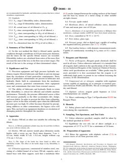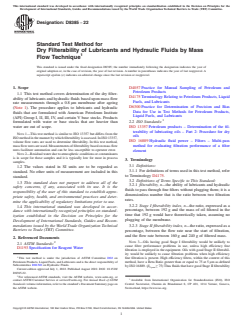 SIGNIFICANCE AND USE 5.1 Precision equipment and high pressure hydraulic machinery require filtered lubricants and fluids to prevent damage from the circulation of hard particulate contaminants. Three types of particulate contaminants are present in lubricants and hydraulic fluids: built in contaminants from the machinery assembly process, generated contaminants from equipment wear, and contaminants that enter from external sources. 5.2 The ability of lubricants and hydraulic fluids to retain their filterability is critical for efficient and reliable machine performance. Normally, the pressure differential across a filter will increase gradually as the filter accumulates dirt, sludge, and wear debris. In order to prevent the filter from collapsing, bypass valves in the filter assembly open when the differential pressure gets too high. If a filter becomes blocked by precipitating additives or other contaminants, the bypass valve will open. This can lead to an equipment shutdown or circulation of damaging particles throughout the machine. SCOPE 1.1 This test method covers determination of the dry filterability of lubricants and hydraulic fluids based upon mass flow rate measurements through a 0.8 µm membrane after ageing (Note 1). The procedure applies to lubricants and hydraulic fluids that are formulated with American Petroleum Institute (API) Group I, II, III, IV, and certain V base stocks. Products formulated with water or base stocks that are heavier than water are out of scope. Note 1: This test method is similar to ISO 13357 but differs from the ISO method in the manner by which filterability is assessed. In ISO 13357, volume flow rates are used to determine filterability. In this test method, mass flow rates are used. Measurements of filterability based on mass flow rates facilitate automation and can be less susceptible to operator error. Note 2: Residual water due to atmospheric conditions or contaminants is in scope for these samples and it is typically low for most in process samples. 1.2 The values stated in SI units are to be regarded as standard. No other units of measurement are included in this standard. 1.3 This standard does not purport to address all of the safety concerns, if any, associated with its use. It is the responsibility of the user of this standard to establish appropriate safety, health, and environmental practices and determine the applicability of regulatory limitations prior to use. 1.4 This international standard was developed in accordance with internationally recognized principles on standardization established in the Decision on Principles for the Development of International Standards, Guides and Recommendations issued by the World Trade Organization Technical Barriers to Trade (TBT) Committee.