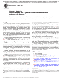 SIGNIFICANCE AND USE 5.1 Personnel responsible for the creation, display, transfer or storage of digital nondestructive evaluation results will use this guide. 5.2 Personnel responsible for the design and manufacture of NDT systems conforming to the DICONDE standard will use this guide. 5.3 Personnel responsible for the purchase and implementation of NDT systems conforming to the DICONDE standard will use this guide. 5.4 This guide will recommend courses of action for utilizing the DICONDE standard for the use cases described in 5.1, 5.2, and 5.3. SCOPE 1.1 The display, transfer and storage of digital nondestructive evaluation data in a common, open format is necessary for the effective interpretation and preservation of evaluation results. ASTM International has developed common open standards for Digital Imaging and Communication in Nondestructive Evaluation (DICONDE) based on the ubiquitous healthcare industry standard Digital Imaging and Communication in Medicine (DICOM). This guide provides an overview of the ASTM International standard practices that address DICONDE and assistance in identifying the correct standard practices for different use cases. 1.2 This document provides an overview of how to utilize the ASTM DICONDE standard practices found in paragraph 2.1.2 on ASTM DICONDE Test Methods Standards for the display, transfer and storage of digital nondestructive test data 1.3 This document provides an overview of how to utilize the DICOM standard found in paragraph 2.2 on Other Documents for the display, transfer and storage of digital nondestructive test data for test methods not explicitly addressed by a DICONDE standard practice but having an equivalent medical imaging modality. 1.4 This document provides recommendations for the display, transfer and storage of nondestructive digital test data not addressed in 1.2 or 1.3. 1.5 This document provides an overview of how to utilize the ASTM DICONDE standard practices found in paragraph 2.1.3 on ASTM DICONDE Interoperability Standards for validating a system that follows the ASTM DICONDE standard for the display, transfer and storage of digital nondestructive test data. 1.6 This document provides an overview of how to utilize the ASTM DICONDE standard practices found in 2.1.3 for validating that two or more systems that follow the ASTM DICONDE standard for the transfer of digital nondestructive test data can successfully transfer data. 1.7 This document provides an overview of how to utilize the ASTM DICONDE standard practices found in 2.1.3 for validating that two or more systems that follow the ASTM DICONDE standard for the display of digital nondestructive test data display data consistently. 1.8 Although this guide contains no values that require units, it does describe methods to store and communicate data that do require units to be properly interpreted. The SI units required by this guide are to be regarded as standard. No other units of measurement are included in this guide. 1.9 This standard does not purport to address all of the safety concerns, if any, associated with its use. It is the responsibility of the user of this standard to establish appropriate safety, health, and environmental practices and determine the applicability of regulatory limitations prior to use. 1.10 This international standard was developed in accordance with internationally recognized principles on standardization established in the Decision on Principles for the Development of International Standards, Guides and Recommendations issued by the World Trade Organization Technical Barriers to Trade (TBT) Committee.