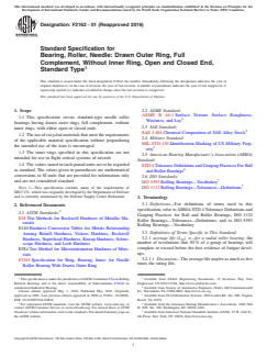 ASTM F2162-01(2016) is a technical specification published by ASTM International. Its full title is "Standard Specification for Bearing, Roller, Needle: Drawn Outer Ring, Full Complement, Without Inner Ring, Open and Closed End, Standard Type". This standard covers: ABSTRACT This specification covers the requirements for standard-type needle roller bearings with drawn outer rings, full complement, without inner rings, and with either open (Type B) or closed ends (Type M). Materials covered by this specification are needle rollers which shall be manufactured from steel, alloy, or carbon, and shall be of Grade E50100 or E52100. Rings, on the other hand, shall be manufactured from steel, alloy, or carbon, with carburizing grade 4620, 4720, 8620, 8720, or 1010-1020. Needle rollers and rings shall be hardened by heat treatment, and bearings shall be coated with rust preventive film. SCOPE 1.1 This specification covers standard-type needle roller bearings having drawn outer rings, full complement, without inner rings, with either open or closed ends. 1.2 The use of recycled materials that meet the requirements of the applicable material specification without jeopardizing the intended use of the item is encouraged. 1.3 The inner rings specified in this specification are not intended for use in flight critical systems of aircraft. 1.4 The values stated in inch-pound units are to be regarded as standard. The values given in parentheses are mathematical conversions to SI units that are provided for information only and are not considered standard. Note 1: This specification contains many of the requirements of MS17131, which was originally developed by the Department of Defense and is currently maintained by the Defense Supply Center Richmond.