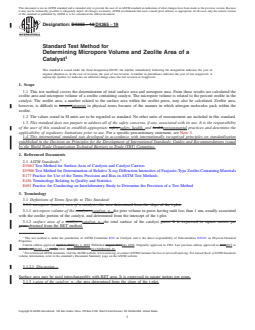 SIGNIFICANCE AND USE 5.1 This gas adsorption method complements the X-ray procedure of Test Method D3906. This test method will be useful to laboratories that do not have X-ray diffractometers. Each test method can be calibrated by use of an appropriate series of mechanical mixtures to provide what may be termed percent zeolite. If there is disorder in the zeolite, the adsorption method will yield higher values than the X-ray method. The reverse will be true if some zeolite pores (micropores) are blocked or filled. SCOPE 1.1 This test method covers the determination of total surface area and mesopore area. From these results are calculated the zeolite area and micropore volume of a zeolite containing catalyst. The micropore volume is related to the percent zeolite in the catalyst. The zeolite area, a number related to the surface area within the zeolite pores, may also be calculated. Zeolite area, however, is difficult to interpret in physical terms because of the manner in which nitrogen molecules pack within the zeolite. 1.2 The values stated in SI units are to be regarded as standard. No other units of measurement are included in this standard. 1.3 This standard does not purport to address all of the safety concerns, if any, associated with its use. It is the responsibility of the user of this standard to establish appropriate safety, health, and environmental practices and determine the applicability of regulatory limitations prior to use. For a specific precautionary statement, see Note 3. 1.4 This international standard was developed in accordance with internationally recognized principles on standardization established in the Decision on Principles for the Development of International Standards, Guides and Recommendations issued by the World Trade Organization Technical Barriers to Trade (TBT) Committee.