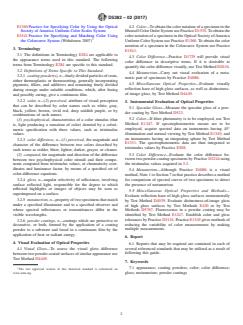 ABSTRACT This standard provides guide to evaluation and testing of color, color difference, gloss, metamerism, and miscellaneous optical properties of optical powder coatings by both visual and instrumental means. Visual evaluation of optical properties shall include visual gloss test method, Munsell Color Order System, and ASTM test standards indicated in the specification. Instrumental evaluation of optical properties shall include specular gloss test, filter photometry, reflection haze, fluorescence, and ASTM test standards indicated in the specification. SCOPE 1.1 This standard provides the user with a guide to the various available practices and test methods for the evaluation of color, color difference, gloss, and metamerism by both visual and by instrumental means. 1.2 This standard does not purport to address all of the safety concerns, if any, associated with its use. It is the responsibility of the user of this standard to establish appropriate safety and health practices and determine the applicability of regulatory limitations prior to use. 1.3 This international standard was developed in accordance with internationally recognized principles on standardization established in the Decision on Principles for the Development of International Standards, Guides and Recommendations issued by the World Trade Organization Technical Barriers to Trade (TBT) Committee.
