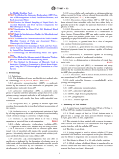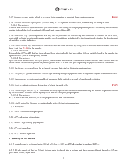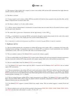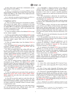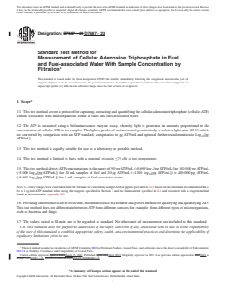 SIGNIFICANCE AND USE 5.1 This test method measures the concentration of cellular-ATP present in the sample. ATP is a constituent of all living cells, including bacteria and fungi. Consequently, the presence of cellular-ATP is an indicator of total metabolically active microbial contamination in fuels. ATP is not associated with matter of non-biological origin. 5.2 This test method is similar to Test Method E2694 except for the volumes sampled. 5.3 This test method differs from Test Method D4012 in that it utilizes filtration and wash steps designed to eliminate interferences that have historically rendered ATP testing unusable with complex organic fluids such as fuel and fuel-associated water. 5.4 This test method differs from Test Method D7463 in several regards: 5.4.1 Test Method D7463 reports relative light units (RLU). Consistent with Test Methods D4012 and E2694, this test method reports ATP concentration. 5.4.2 This test method detects only cellular-ATP and it can be used to detect cellular-ATP in fuels and fuel stocks from which small quantities of water do not separate readily (for example, ethanol blended gasoline containing ≥5 % v/v ethanol). Test Method D7463 cannot be used to recover ATP from fuels from which small quantities of water do not separate readily (for example, ethanol blended gasoline containing ≥5 % v/v ethanol). 5.4.3 This test method measures cellular-ATP in a single measurement (as pg ATP/mL). Test Method D7463 detects total ATP (as RLU) and extra-cellular ATP (as RLU) using two separate analyses and permits computation of cellular-ATP (as RLU) as the difference between total and extracellular ATP. 5.4.4 Test Method D7463 suggests a nominal 500 mL fuel sample volume. This test method suggests a nominal 20 mL fuel sample. 5.5 This test method can be used with all fuels specified in Specifications D396, D975, D1655, D2069, D2880, D3699, D6751, and D7467 and other fuels with nominal viscosities ≤75 cSt at 20° ± 2°. 5.6 The ATP test pro... SCOPE 1.1 This test method covers a protocol for capturing, extracting and quantifying the cellular adenosine triphosphate (cellular-ATP) content associated with microorganisms found in fuels and fuel-associated water. 1.2 The ATP is measured using a bioluminescence enzyme assay, whereby light is generated in amounts proportional to the concentration of cellular-ATP in the samples. The light is produced and measured quantitatively as relative light units (RLU) which are converted by comparison with an ATP standard, computation to pg ATP/mL and optional further transformation to Log10[pg ATP/mL]. 1.3 This test method is equally suitable for use as a laboratory or portable method. 1.4 This test method is limited to fuels with a nominal viscosity ≤75 cSt at test temperature. 1.5 This test method detects ATP concentrations in the range of 5.0 pg ATP/mL (≈0.699 log10[pg ATP/mL]) to 100 000 pg ATP/mL (≈5.000 log10[pg ATP/mL]) for 20 mL samples of fuel and 20 pg ATP/mL (≈1.301 log10[pg ATP/mL]) to 400 000 pg ATP/mL (≈5.602 log10[pg ATP/mL]) for 5 mL samples of fuel-associated water. Note 1: These ranges were calculated with the formula for calculating sample ATP in pg/mL provided in 12.1 based on the minimum recommended RLU for a 1 ng/mL ATP standard when using the reagents specified in Section 7 and the luminometer specified in 6.4 and corrected with a reagent-method blank as determined in Appendix X5. 1.6 Providing interferences can be overcome, bioluminescence is a reliable and proven method for qualifying and quantifying ATP. This test method does not differentiate between ATP from different sources, for example: from different types of microorganisms, such as bacteria and fungi. 1.7 The values stated in SI units are to be regarded as standard. No other units of measurement are included in this standard. 1.8 This standard does not purport to address all of the safety concerns, if any, associated with its us...