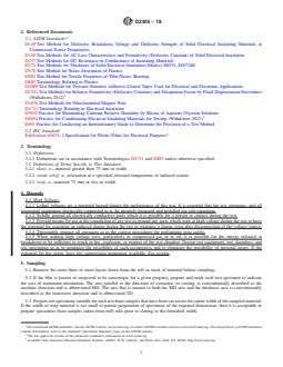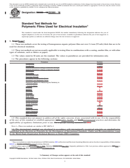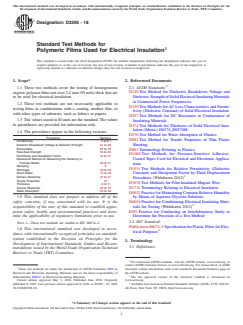 ASTM D2305-18, titled Standard Test Methods for Polymeric Films Used for Electrical Insulation, is a comprehensive standard published by ASTM International. It outlines a set of test methods for evaluating the properties of homogeneous organic polymer films not exceeding 2.4 mm (95 mils) in thickness, specifically when these films are used as electrical insulation in industrial applications. The standard emphasizes maintaining consistent environmental conditions during testing, as properties of polymeric films can change rapidly with shifts in temperature and humidity. ASTM D2305-18 does not apply to films in combination with coatings or other substrates such as fabrics or papers.