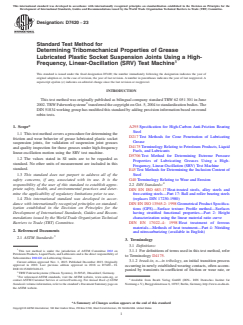 ASTM D7420-23 is a standard published by ASTM International. Its full title is "Standard Test Method for Determining Tribomechanical Properties of Grease Lubricated Plastic Socket Suspension Joints Using a High-Frequency, Linear-Oscillation (SRV) Test Machine". This standard covers: SIGNIFICANCE AND USE 5.1 This test method can be used to quickly determine the lubricating ability of greases lubricating automotive plastic socket suspension joints. This test method has found wide application in qualifying greases used in chassis systems. This test method is a material and application oriented approach based on inputs from field experiences for characterizing the tribological behavior (friction and wear) using random, discrete, and constant parameter combinations. Users of this test method should determine whether results correlate with field performance or other applications prior to commercialization. SCOPE 1.1 This test method covers a procedure for determining the friction and wear behavior of grease lubricated plastic socket suspension joints, for validation of suspension joint greases and quality inspection for those greases under high-frequency linear-oscillation motion using the SRV test machine. 1.2 The values stated in SI units are to be regarded as standard. No other units of measurement are included in this standard. 1.3 This standard does not purport to address all of the safety concerns, if any, associated with its use. It is the responsibility of the user of this standard to establish appropriate safety, health, and environmental practices and determine the applicability of regulatory limitations prior to use. 1.4 This international standard was developed in accordance with internationally recognized principles on standardization established in the Decision on Principles for the Development of International Standards, Guides and Recommendations issued by the World Trade Organization Technical Barriers to Trade (TBT) Committee.