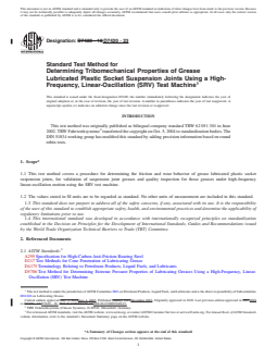 SIGNIFICANCE AND USE 5.1 This test method can be used to quickly determine the lubricating ability of greases lubricating automotive plastic socket suspension joints. This test method has found wide application in qualifying greases used in chassis systems. This test method is a material and application oriented approach based on inputs from field experiences for characterizing the tribological behavior (friction and wear) using random, discrete, and constant parameter combinations. Users of this test method should determine whether results correlate with field performance or other applications prior to commercialization. SCOPE 1.1 This test method covers a procedure for determining the friction and wear behavior of grease lubricated plastic socket suspension joints, for validation of suspension joint greases and quality inspection for those greases under high-frequency linear-oscillation motion using the SRV test machine. 1.2 The values stated in SI units are to be regarded as standard. No other units of measurement are included in this standard. 1.3 This standard does not purport to address all of the safety concerns, if any, associated with its use. It is the responsibility of the user of this standard to establish appropriate safety, health, and environmental practices and determine the applicability of regulatory limitations prior to use. 1.4 This international standard was developed in accordance with internationally recognized principles on standardization established in the Decision on Principles for the Development of International Standards, Guides and Recommendations issued by the World Trade Organization Technical Barriers to Trade (TBT) Committee.