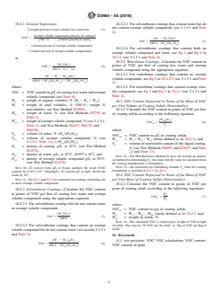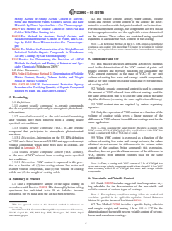SIGNIFICANCE AND USE 5.1 This practice discusses applicable ASTM test methods used in the determination of the VOC content of paints and related coatings and provides equations for calculating the VOC content expressed as the mass of VOC: (1) per unit volume of coating less water and exempt volatile compounds, and (2) per unit volume of coating solids and (3) per unit mass of coating solids. 5.2 Volatile organic compound content is used to compare the amount of VOC released from different coatings used for the same application, that is, to coat the same area to the same dry film thickness (assuming the same application efficiency). 5.3 VOC content data are required by various regulatory agencies. 5.4 Only the expression of VOC content as a function of the volume of coating solids gives a linear measure of the difference in VOC released from different coatings used for the same application. Note 4: Thus assuming the same transfer efficiency, a coating with VOC content of 3 lb of VOC/gal of solids would release 1/2 the VOC that would a coating with 6 lb of VOC/gal of solids. 5.5 When VOC content is expressed as a function of the volume of coating less water and exempt solvents, the values obtained do not account for differences in the volume solids content of the coatings being compared: this expression, therefore, does not provide a linear measure of the difference in VOC emitted from different coatings used for the same application. Note 5: Thus, a coating with VOC content of 3 lb of VOC/gal less water and exempt volatile compounds would release about 85 % less VOC than a coating with 6 lb of VOC/gal less water and exempt volatile compounds. SCOPE 1.1 This practice measures the volatile organic compound (VOC) content of solventborne and waterborne paints and related coatings as determined from the quantity of material released from a sample under specified bake conditions and subtracting exempt volatile compounds and water if present. Note 1: The regulatory definition, under the control of the U.S. EPA, can change. To ensure currency, contact the local air pollution control agency. 1.2 This practice provides a guide to the selection of appropriate ASTM test methods for the determination of VOC content. 1.3 Certain organic compounds that may be released under the specified bake conditions are not counted toward coating VOC content because they do not participate appreciably in atmospheric photochemical reactions. Such negligibly photochemically reactive compounds are referred to, as exempt volatile compounds in this practice. Note 2: Information on the US EPA definition of VOC and a list of the current US EPA approved exempt volatile compounds which have been used in coatings, are provided in Appendix X3. 1.4 VOC content is calculated as a function of (1) the volume of coating less water and exempt volatile compounds, and (2) the volume of coating solids, and (3) the weight of coating solids. 1.5 The values stated in SI units are to be regarded as standard. 1.6 This standard does not purport to address all of the safety concerns, if any, associated with its use. It is the responsibility of the user of this standard to establish appropriate safety, health, and environmental practices and determine the applicability of regulatory limitations prior to use. 1.7 This international standard was developed in accordance with internationally recognized principles on standardization established in the Decision on Principles for the Development of International Standards, Guides and Recommendations issued by the World Trade Organization Technical Barriers to Trade (TBT) Committee.