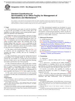 SIGNIFICANCE AND USE 4.1 Each Facility Rating Scale (see Figs. 1-4) in this classification provides a means to estimate the level of serviceability of a building or facility for one topic of serviceability and to compare that level against the level of any other building or facility. 4.2 This classification can be used for comparing how well different buildings or facilities meet a particular requirement for serviceability. It is applicable despite differences such as location, structure, mechanical systems, age, and building shape. 4.3 This classification can be used to estimate the following: 4.3.1 Serviceability of an existing facility for uses other than its present use. 4.3.2 Serviceability (potential) of a facility that has been planned but not yet built. 4.3.3 Serviceability (potential) of a facility for which remodeling has been planned. 4.4 Use of this classification does not result in building evaluation or diagnosis. Building evaluation or diagnosis generally requires a special expertise in building engineering or technology and the use of instruments, tools, or measurements. 4.5 This classification applies only to facilities that are building constructions, or parts thereof. (While this classification may be useful in rating the serviceability of facilities that are not building constructions, such facilities are outside the scope of this classification.) 4.6 This classification is not intended for, and is not suitable for, use for regulatory purposes, nor for fire hazard assessment nor for fire risk assessment. SCOPE 1.1 This classification covers pairs of scales for classifying an aspect of the serviceability of an office facility, that is, the capability of an office facility to meet certain possible requirements for operations and maintenance. 1.2 Within that aspect of serviceability, each pair of scales, shown in Figs. 1-4, are for classifying one topic of serviceability. Each paragraph in an Occupant Requirement Scale (see Figs. 1-4) summarizes one level of serviceability on that topic, which occupants might require. The matching entry in the Facility Rating Scale (see Figs. 1-4) is a translation of the requirement into a description of certain features of a facility which, taken in combination, indicate that the facility is likely to meet that level of required serviceability. FIG. 1 Scale B.3.1 for Strategy and Program for Operations and Maintenance FIG. 1 Scale B.3.1 for Strategy and Program for Operations and Maintenance (continued) FIG. 2 Scale B.3.2 for Competences of In-house Staff FIG. 2 Scale B.3.2 for Competences of In-house Staff (continued) FIG. 3 Scale B.3.3 for Occupant Satisfaction FIG. 3 Scale B.3.3 for Occupant Satisfaction (continued) FIG. 4 Scale B.3.4 for Information on Unit Costs and Consumption FIG. 4 Scale B.3.4 for Information on Unit Costs and Consumption (continued) 1.3 The entries in the Facility Rating Scale (see Figs. 1-4) are indicative and not comprehensive. They are for quick scanning and rating a facility and not for evaluating or diagnosing it. 1.4 This classification can be used to estimate the level of serviceability of an existing facility. It can also be used to estimate the serviceability of a facility that has been planned but not yet built, such as one for which single-line drawings and outline specifications have been prepared. 1.5 This classification indicates what would cause a facility to be rated at a certain level of serviceability but does not state how to conduct a serviceability rating nor how to assign a serviceability score. That information is found in Practice E1334. The scales in this classification are complimentary to and compatible with Practice E1334. Each requires the other. 1.6 The values stated in inch-pound units are to be regarded as standard. No other units of measurement are included in this standard. 1.7 This international standard was developed in accordance wit...