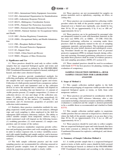 ASTM E2458-17 is a standard published by ASTM International. Its full title is "Standard Practices for Bulk Sample Collection and Swab Sample Collection of Visible Powders Suspected of Being Biological Agents and Toxins from Nonporous Surfaces". This standard covers: SIGNIFICANCE AND USE 4.1 These practices should be used only to collect visible samples that are suspected biological agents and toxins and have been field screened as defined by the FBI-DHS-HHS/CDC Coordinated Document for explosive hazard, radiological hazard, and other acute chemical hazards. 4.2 These practices provide standardized methods for collecting, packaging, and transporting suspicious visible powder samples that are suspected biological agents and toxins. Collection of a bulk powder material from a nonporous surface using a sterile swab and laminated card as the collection devices to move the material into a container will depend on several factors, including (but not limited to): (1) amount of visible powder present; (2) sample composition; (3) choice of collection device; (4) size and shape of the collection container; (5) ability of the powder to become aerosolized; (6) texture and porosity of the surface; (7) humidity; (8) air movement; and (9) electrostatic properties of powders and collection tools/containers. 4.3 Similarly, these practices standardize methods for sampling suspicious visible powders for on-site analysis, although wipe and swab sampling is often employed in the field for subsequent LRN reference laboratory analysis. The ability to collect suitable samples from nonporous surfaces using a sterile moistened swab will depend on the following factors: (1) swabbing procedure; (2) swab material; (3) sample composition; and (4) texture of the surface. 4.4 These practices standardize suspicious powder collection and packaging procedures and swab sampling procedures in order to reduce exposure risk, to reduce variability associated with sample handling and sample analysis, and to increase reliability of sampling visible powder samples from nonporous surfaces. 4.5 The bulk sample collection practice and the swab sampling practice are recommended for collecting amassed or dispersed powder samples from all nonporous surfaces on which the suspicious po... SCOPE 1.1 These practices address collection of visible powders that are suspected biological agents and toxins from solid nonporous surfaces using a bulk collection method, using a dry swab and laminated card, followed by a swab sampling method using a sterile moistened swab. Bulk powder samples are collected and packaged in a manner that permits the maximum amount of the sample to be safely transported to a reference laboratory within the Centers for Disease Control and Prevention (CDC) national Laboratory Response Network (LRN)2 for confirmatory identification and safe storage. If the source of the powder is a letter or small package, that item is also packaged in a manner that permits it to be safely transported to an LRN reference laboratory. A sterile moistened swab may be used to collect residual powder from the nonporous surface and may be used to conduct on-site biological assessments for the purpose of testing for biological agents and toxins. 1.2 These practices are performed in coordination with the Federal Bureau of Investigation (FBI) as part of a risk assessment including hazard assessment and threat credibility evaluation as recommended and clarified in Guide E2770. The decision to implement these practices and collect a public safety sample will be made by members of the response community of the jurisdiction assuming responsibility through coordination with the FBI and the receiving LRN reference laboratory. 1.3 Sample Collection Method A covers the bulk collection and packaging of suspicious visible powders that are suspected biological agents and toxins from solid nonporous surfaces. All samples suspected to be biological agents and toxins on nonporous surfaces should be collected according to Sample Collection Method A and sent to an LRN reference laboratory for confirmatory testing. 1.4 Sample Collection Method B covers swab sampling of residual suspicious powders that are suspected biological ag...