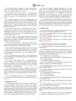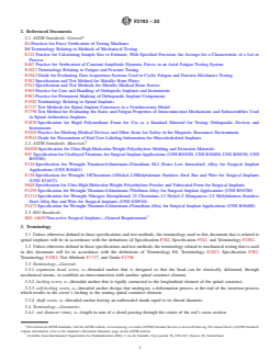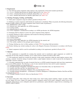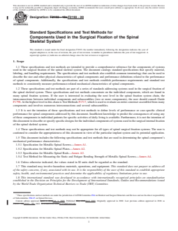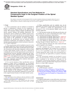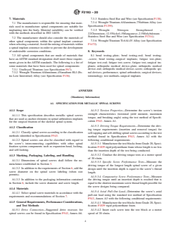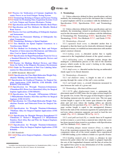ABSTRACT These specifications and test methods provide standard specifications that specify material, labeling, and handling requirements for components used in surgical fixation of the spinal skeletal system such as metallic spinal screws, spinal plates, and spinal rods. The specifications and test methods establish (1) common terminology that can be used to describe the size and other physical characteristics of spinal components and performance definitions related to the performance of spinal components, and (2) performance requirements and standard test methods to consistently measure performance-related mechanical characteristics of spinal components. It is not the intention of these specifications and test methods to define levels of performance or case-specific clinical performance for spinal components and to describe or specify specific designs for the individual components. For these specifications and test methods may not be appropriate for all types of spinal surgical fixation systems, the appropriateness of these specifications in view of the particular implant system and its potential application shall be considered. The test methods include static and fatigue bending strength tests. Requirements for marking and packaging are specified as well. SIGNIFICANCE AND USE 4.1 Spinal implant constructs are typically a compilation of several components. Screws, plates, and rods are integral components of many spinal implant constructs. These components are designed to transfer load between the bone and the longitudinal or transverse element, or both. These specifications and test methods identify specifications for such components and define standard equivalent test methods that can be used when evaluating different related component designs. 4.2 Since the loading of spinal components in-vivo may differ from the loading configurations addressed in these specifications and test methods, the results obtained from this document may not predict in-vivo performance of either the components or the construct as a whole. Such tests can, however, be used to compare different component designs in terms of relevant mechanical performance characteristics. 4.3 The performance-related mechanical characteristics determined by these specifications and test methods will supply the user with information that may be used to predict the mechanical performance of different design variations of similar (function and indication) spinal construct components. SCOPE 1.1 These specifications and test methods are intended to provide a comprehensive reference for the components of systems used in the surgical fixation of the spinal skeletal system. The document catalogs standard specifications that specify material, labeling, and handling requirements. The specifications and test methods also establish common terminology that can be used to describe the size and other physical characteristics of spinal components and performance definitions related to the performance of spinal components. Additionally, the specifications and test methods establish performance requirements and standard test methods to consistently measure performance-related mechanical characteristics of spinal components. 1.2 These specifications and test methods are part of a series of standards addressing systems used in the surgical fixation of the spinal skeletal system. These specifications and test methods concentrate on the individual components, which are found in many spinal fixation systems. If the user is interested in evaluating the next level in the spinal fixation system chain, the interconnections between individual components and subassemblies (two or more components), the user should consult Guide F1798. At the highest level in this chain is Test Methods F1717, which is used to evaluate an entire construct assembled from many components and involves numerous interconnections and several subassemblies. 1.3 It is not the intention of th...