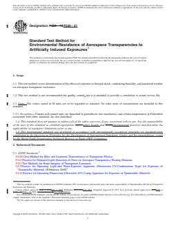 SIGNIFICANCE AND USE 4.1 This test method, when applied to aerospace transparencies of either monolithic glass/plastic or laminated combinations, is a measure of the ability of the transparency to withstand the effects of artificially induced environments. The test applies to configurations employing electrically conductive coatings, and also to uncoated materials. 4.2 The resistance of the transparent enclosure to environmental effects may vary appreciably depending on the size, geometry, material of construction, coating integrity, coating density, and other factors. SCOPE 1.1 This test method covers determination of the effects of exposure to thermal shock, condensing humidity, and simulated weather on aerospace transparent enclosures. 1.2 This test method is not recommended for quality control, nor is it intended to provide a correlation to actual service life. 1.3 Units—The values stated in SI units are to be regarded as standard. No other units of measurement are included in this standard. 1.3.1 Exceptions—Certain inch-pound units are furnished in parentheses (not mandatory) and certain temperatures in Fahrenheit associated with other standards are also furnished. 1.4 This standard does not purport to address all of the safety concerns, if any, associated with its use. It is the responsibility of the user of this standard to establish appropriate safety, health, and environmental practices and determine the applicability of regulatory limitations prior to use. 1.5 This international standard was developed in accordance with internationally recognized principles on standardization established in the Decision on Principles for the Development of International Standards, Guides and Recommendations issued by the World Trade Organization Technical Barriers to Trade (TBT) Committee.