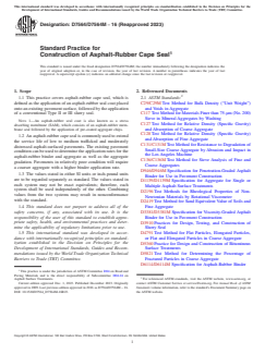 ASTM D7564/D7564M-16(2023) is a standard published by ASTM International. Its full title is "Standard Practice for Construction of Asphalt-Rubber Cape Seal". This standard covers: SIGNIFICANCE AND USE 3.1 The procedure described in this practice is used to design and construct an asphalt-rubber cape seal that will provide a wearing course when subjected to low to medium traffic volumes and where the pavement distress is due to block-type cracking resulting from pavement aging or reflective cracking only (not where there are clear indications of fatigue cracking due to repeated heavy axle loads). Note 2: Block cracking is defined in Practice D6433. See Appendix X1 for an example of block cracking due to aging. SCOPE 1.1 This practice covers asphalt-rubber cape seal, which is defined as the application of an asphalt-rubber seal coat placed onto an existing pavement surface, followed by the application of a conventional Type II or III slurry seal. Note 1: An asphalt-rubber seal coat is also known as a stress absorbing membrane (SAM), which consists of an asphalt-rubber membrane seal followed by the application of pre-coated aggregate chips. 1.2 An asphalt-rubber cape seal is commonly used to extend the service life of low to medium trafficked and moderately distressed asphalt-surfaced pavements. The existing pavement condition can be used to determine the application rates for the asphalt-rubber binder and aggregate as well as the aggregate gradation. Pavements in relatively poor condition will require a coarser aggregate with a higher binder application rate. 1.3 The values stated in either SI units or inch-pound units are to be regarded separately as standard. The values stated in each system may not be exact equivalents; therefore, each system shall be used independently of the other. Combining values from the two systems may result in nonconformance with the standard. 1.4 This standard does not purport to address all of the safety concerns, if any, associated with its use. It is the responsibility of the user of this standard to establish appropriate safety, health, and environmental practices and determine the applicability of regulatory limitations prior to use. 1.5 This international standard was developed in accordance with internationally recognized principles on standardization established in the Decision on Principles for the Development of International Standards, Guides and Recommendations issued by the World Trade Organization Technical Barriers to Trade (TBT) Committee.