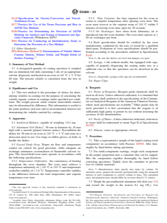SIGNIFICANCE AND USE 4.1 This test method is the procedure of choice for determining volatiles in coatings for the purpose of calculating the volatile organic content in coatings under specified test conditions. The weight percent solids content (nonvolatile matter) may be determined by difference. This information is useful to the paint producer and user and to environmental interests for determining the volatiles emitted by coatings. SCOPE 1.1 This test method describes a procedure for the determination of the weight percent volatile content of solventborne and waterborne coatings. Test specimens are heated at 110 °C ± 5 °C for 60 min. Note 1: The coatings used in these round-robin studies represented air-dried, air-dried oxidizing, heat-cured baking systems, and also included multicomponent paint systems. 1.2 Sixty minutes at 110 °C ± 5 °C is a general purpose test method based on the precision obtained with both solventborne and waterborne coatings (see Section 9). 1.3 This test method is viable for coatings wherein one or more parts may, at ambient conditions, contain liquid coreactants that are volatile until a chemical reaction has occurred with another component of the multi-package system. Note 2: Committee D01 has run round-robin studies on volatiles of multicomponent paint systems. The only change in procedure is to premix the weighed components in the correct proportions and allow the specimens to stand at room temperature for 1 h prior to placing them into the oven. 1.4 Test Method D5095 for Determination of the Nonvolatile Content in Silanes, Siloxanes and Silane-Siloxane Blends Used in Masonry Water Repellent Treatments is the standard method for nonvolatile content of these types of materials. 1.5 Test Methods D5403 for Volatile Content of Radiation Curable Materials is the standard method for determining nonvolatile content of radiation curable coatings, inks and adhesives. 1.6 Test Method D6419 for Volatile Content of Sheet-Fed and Coldset Web Offset Printing Inks is the method of choice for these types of printing inks. 1.7 This test method may not be applicable to all types of coatings. Other procedures may be substituted with mutual agreement between the producer and the user. Note 3: If unusual decomposition or degradation of the specimen occurs during heating, the actual time and temperature used to cure the coating in practice may be substituted for the time and temperature specified in this test method, subject to mutual agreement between the producer and the user. The U.S. EPA Reference Method 24 specifies 110 °C ± 5 °C for 1 h for coatings. Note 4: Practice D3960 for Determining Volatile Organic Compound (VOC) Content of Paints and Related Coatings describes procedures and calculations and provides guidance on selecting test methods to determine VOC content of solventborne and waterborne coatings. 1.8 The values stated in SI units are to be regarded as standard. No other units of measurement are included in this standard. 1.9 This standard does not purport to address all of the safety concerns, if any, associated with its use. It is the responsibility of the user of this standard to establish appropriate safety, health, and environmental practices and determine the applicability of regulatory limitations prior to use. 1.10 This international standard was developed in accordance with internationally recognized principles on standardization established in the Decision on Principles for the Development of International Standards, Guides and Recommendations issued by the World Trade Organization Technical Barriers to Trade (TBT) Committee.