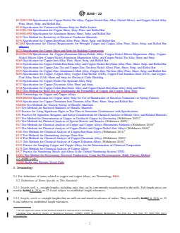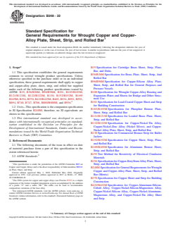 ASTM B248-22 is a technical specification published by ASTM International. Its full title is "Standard Specification for General Requirements for Wrought Copper and Copper-Alloy Plate, Sheet, Strip, and Rolled Bar". This standard covers: ABSTRACT This specification establishes the general requirements common to several wrought products including copper and copper-alloy plates, sheets, strips, and rolled bars. The numerical values in this specification are not presented in inch-pound units, but rather, in metric or SI units only. The material for manufacture shall be a cast bar, cake, or slab of such purity and soundness as to be suitable for processing by hot- or cold-working, and annealing to produce a uniform wrought structure in the finished product. The edges shall be slit, sheared, sawed, or rolled, as specified. When rolled edges are required, they may be produced by either rolling or drawing to one of the following specified edge contours: square edges (square corners), rounded corners, rounded edges, and full-rounded edges. Products shall be sampled and prepared, then tested accordingly to examine their conformance to dimensional (thickness, length, width, weight, and straightness), mechanical (tensile and yield strength, Rockwell hardness, and elongation), electrical (resistivity and conductivity), chemical composition, and grain size requirements. SCOPE 1.1 This specification establishes the general requirements common to several wrought product specifications. Unless otherwise specified in the purchase order or in an individual specification, these general requirements shall apply to copper and copper-alloy plate, sheet, strip, and rolled bar supplied under each of the following product specifications issued by ASTM: B19, B36/B36M, B96/B96M, B101, B103/B103M, B121/B121M, B122/B122M, B130, B152/B152M, B169/B169M, B194, B370, B422/B422M, B465, B534, B591, B592, B694, B740, B747, B768, B888/B888M, and B936.2 1.2 Units—This specification is the companion specification to SI Specification B248M; therefore, no SI equivalents are shown in this specification. 1.3 This international standard was developed in accordance with internationally recognized principles on standardization established in the Decision on Principles for the Development of International Standards, Guides and Recommendations issued by the World Trade Organization Technical Barriers to Trade (TBT) Committee.