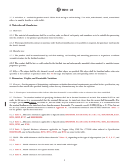 ABSTRACT This specification establishes the general requirements common to several wrought products including copper and copper-alloy plates, sheets, strips, and rolled bars. The numerical values in this specification are not presented in inch-pound units, but rather, in metric or SI units only. The material for manufacture shall be a cast bar, cake, or slab of such purity and soundness as to be suitable for processing by hot- or cold-working, and annealing to produce a uniform wrought structure in the finished product. The edges shall be slit, sheared, sawed, or rolled, as specified. When rolled edges are required, they may be produced by either rolling or drawing to one of the following specified edge contours: square edges (square corners), rounded corners, rounded edges, and full-rounded edges. Products shall be sampled and prepared, then tested accordingly to examine their conformance to dimensional (thickness, length, width, weight, and straightness), mechanical (tensile and yield strength, Rockwell hardness, and elongation), electrical (resistivity and conductivity), chemical composition, and grain size requirements. SCOPE 1.1 This specification establishes the general requirements common to several wrought product specifications. Unless otherwise specified in the purchase order or in an individual specification, these general requirements shall apply to copper and copper-alloy plate, sheet, strip, and rolled bar supplied under each of the following product specifications issued by ASTM: B19, B36/B36M, B96/B96M, B101, B103/B103M, B121/B121M, B122/B122M, B130, B152/B152M, B169/B169M, B194, B370, B422/B422M, B465, B534, B591, B592, B694, B740, B747, B768, B888/B888M, and B936.2 1.2 Units—This specification is the companion specification to SI Specification B248M; therefore, no SI equivalents are shown in this specification. 1.3 This international standard was developed in accordance with internationally recognized principles on standardization established in the Decision on Principles for the Development of International Standards, Guides and Recommendations issued by the World Trade Organization Technical Barriers to Trade (TBT) Committee.