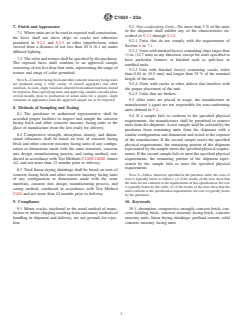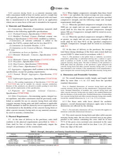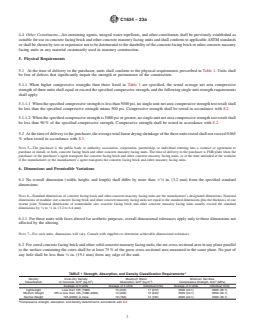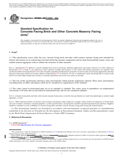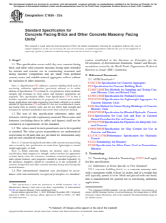 ASTM C1634-23a is a technical specification published by ASTM International. Its full title is "Standard Specification for Concrete Facing Brick and Other Concrete Masonry Facing Units". This standard covers: ABSTRACT This specification covers solid, dry-cast, concrete facing brick intended for interior and exterior use in constructing structural and facing masonry components and are made from portland cement, water, and suitable mineral aggregates with or without the inclusion of other materials. Concrete facing bricks shall be grouped into density classifications as either lightweight, medium weight, or normal weight. Specimens shall be sampled, tested, and conform accordingly to the specified physical requirements (oven-dry density, maximum water absorption, and minimum net area compressive strength) suitable for their density classification. SCOPE 1.1 This specification covers solid, dry-cast, concrete facing brick and other solid concrete masonry facing units intended for interior and exterior use in constructing structural and facing masonry components and are made from portland cement, water, and suitable mineral aggregates with or without the inclusion of other materials. Note 1: Specification C55 addresses concrete building brick used in non-facing, utilitarian applications (previously referred to in earlier editions of Specification C55 as Grade S—for general use where moderate strength and resistance to frost action and moisture penetration are required). This specification differs from Specification C55 in that it includes expanded consideration for properties of concrete units used in facing applications and other exposures (previously referred to in earlier editions of Specification C55 as Grade N—for use as architectural veneer and facing units in exterior walls and for use where high strength and resistance to moisture penetration and severe frost action are desired). 1.2 The text of this specification references notes and footnotes which provide explanatory material. These notes and footnotes (excluding those in tables and figures) shall not be considered as requirements of the standard. 1.3 The values stated in inch-pound units are to be regarded as standard. The values given in parentheses are mathematical conversions to SI units that are provided for information only and are not considered standard. Note 2: Concrete facing brick and other solid concrete masonry facing units covered by this specification are made from lightweight or normal weight aggregates, or both. Note 3: When particular features are desired, such as density classification, high compressive strength, surface textures for appearance or bond, finish, color, fire resistance, insulation, acoustical properties, or other special features, such properties should be specified separately by the purchaser. Suppliers should be consulted as to the availability of concrete facing brick and other concrete masonry facing units having the desired features. 1.4 This international standard was developed in accordance with internationally recognized principles on standardization established in the Decision on Principles for the Development of International Standards, Guides and Recommendations issued by the World Trade Organization Technical Barriers to Trade (TBT) Committee.