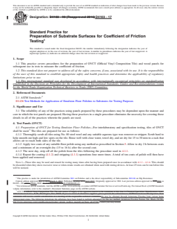 ASTM D4103-17 is a standard published by ASTM International. Its full title is "Standard Practice for Preparation of Substrate Surfaces for Coefficient of Friction Testing". This standard covers: SIGNIFICANCE AND USE 3.1 The reliability of any of the practices using panels prepared by these procedures may be dependent upon the manner and care in which the test panels are prepared. Having these practices in a single procedure eliminates the necessity for covering these details in all of the practices wherein the panels are used. SCOPE 1.1 This practice covers procedures for the preparation of OVCT (Official Vinyl Composition Tile) and wood panels for subsequent use in tests to measure the coefficient of friction. 1.2 This standard does not purport to address all of the safety concerns, if any, associated with its use. It is the responsibility of the user of this standard to establish appropriate safety and health practices and determine the applicability of regulatory limitations prior to use. 1.3 This international standard was developed in accordance with internationally recognized principles on standardization established in the Decision on Principles for the Development of International Standards, Guides and Recommendations issued by the World Trade Organization Technical Barriers to Trade (TBT) Committee.