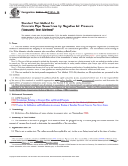SIGNIFICANCE AND USE 5.1 This is not a routine test. The values recorded are applicable only to the sewer being tested and at the time of testing. SCOPE 1.1 This test method covers procedures for testing concrete pipe sewerlines, when using the negative air pressure (vacuum) test method to demonstrate the integrity of the installed material and the construction procedures. This test method covers testing of 4 to 36-in. diameter circular concrete pipe sewerlines utilizing gasketed joints. Note 1: The user of this test method is advised that methods described herein may also be used as a preliminary test to enable the manufacturer or installer to demonstrate the condition of sewer pipe prior to delivery or backfill. Minimum test times presented in Table 1 are for pipelines. Holding times for testing an individual pipe may have to be increased to allow for the accumulation of leakage when the tested pipe are incorporated into a continuous pipeline. Note 2: The user of this test method is advised that the negative air pressure (vacuum) test criteria presented in this test method are similar to those in general use. The test and criteria have been used widely and successfully in testing smaller diameter pipe. Larger pipe will be accepted more conveniently by visual inspection and individual joint testing. Note 3: Test times tabulated and the rate of air loss in this standard are based on successful testing of installed pipelines. However, since air and water have different physical properties, retests of some pipelines not meeting field air tests have been successful when tested with water. 1.2 This test method is the inch-pound companion to Test Method C1214M; therefore, no SI equivalents are presented in the test method. 1.3 This standard does not purport to address all of the safety concerns, if any, associated with its use. It is the responsibility of the user of this standard to establish appropriate safety, health, and environmental practices and determine the applicability of regulatory limitations prior to use. See Section 6 for specific safety precautions. 1.4 This international standard was developed in accordance with internationally recognized principles on standardization established in the Decision on Principles for the Development of International Standards, Guides and Recommendations issued by the World Trade Organization Technical Barriers to Trade (TBT) Committee.