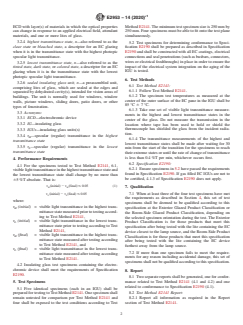 ASTM E2953-14(2020)e1 is a technical specification published by ASTM International. Its full title is "Standard Specification for Evaluating Accelerated Aging Performance of Electrochromic Devices in Sealed Insulating Glass Units". This standard covers: ABSTRACT This specification applies to all electrochromic (EC) glass whose visible light transmittance or near infrared light transmittance properties, or both, can be changed reversibly by the application or removal of an electrical voltage. It covers absorptive and reflective EC devices in preassembled permanently sealed insulting glass units with one or more cavities in which at least one lite contains an EC device (which may be in the form of a laminated lite or a single pane with coatings applied). This specification is also valid for EC devices in preassembled insulating glass units with capillary tubes intentionally left open, but not for other types of dynamic glass which do not solely require an electrical stimulus to change light transmittance such as photochromic and thermochromic glazings and hybrid active/passive chromogenics. This specification is applicable only to sealed insulating glass units that are constructed with glass and fabricated for vision glass areas for use in buildings, such as sliding doors, windows, skylights, and exterior wall systems. SCOPE 1.1 This specification is applicable to all electrochromic (EC) glass whose visible light transmittance or near infrared light transmittance properties, or both, can be changed reversibly by the application or removal of an electrical voltage. This includes absorptive and reflective EC devices. 1.2 This specification does not apply to other types of dynamic glass which do not solely require an electrical stimulus to change light transmittance such as photochromic and thermochromic glazings and hybrid active/passive chromogenics. 1.3 This specification covers electrochromic devices in preassembled permanently sealed insulting glass units with one or more cavities in which at least one lite contains an EC device (which may be in the form of a laminated lite or a single pane with coatings applied). This specification is also applicable to EC devices in preassembled insulating glass units with capillary tubes intentionally left open. As such this specification also requires conformance to Specification E2190. 1.4 This specification is applicable only to sealed insulating glass units that are constructed with glass and fabricated for vision glass areas for use in buildings, such as sliding doors, windows, skylights, and exterior wall systems. 1.5 Qualification under this specification is intended to provide a basis for evaluating the aging performance of electrochromic devices in sealed insulating glass units. 1.6 The values stated in SI units are to be regarded as standard. No other units of measurement are included in this standard. 1.7 This standard does not purport to address all of the safety concerns, if any, associated with its use. It is the responsibility of the user of this standard to establish appropriate safety, health, and environmental practices and determine the applicability of regulatory limitations prior to use. 1.8 This international standard was developed in accordance with internationally recognized principles on standardization established in the Decision on Principles for the Development of International Standards, Guides and Recommendations issued by the World Trade Organization Technical Barriers to Trade (TBT) Committee.