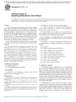 ASTM C1751-21 is a guide published by ASTM International. Its full title is "Standard Guide for Sampling Radioactive Tank Waste". This standard covers: SIGNIFICANCE AND USE 4.1 Obtaining samples of high-level waste created during the reprocessing of spent nuclear fuels presents unique challenges. Generally, high-level waste is stored in tanks with limited access to decrease the potential for radiation exposure to personnel. Samples must be obtained remotely because of the high radiation dose from the bulk material and the samples, samples require shielding for handling, transport, and storage. The quantity of sample that can be obtained and transported is small due to the hazardous nature of the samples as well as their high radiation dose. 4.2 Many high-level wastes have been treated to remove strontium (Sr) or cesium (Cs), or both, have undergone liquid volume reductions through pumping and forced evaporation or have been pH modified, or both, to decrease corrosion of the tanks. These processes, as well as waste streams added from multiple process plant operations, often resulted in precipitation, and produced multiphase wastes that are heterogeneous. Evaporation of water from waste with significant dissolved salts concentrations has occurred in some tanks due to the high heat load associated with the high-level waste and by pumping and intentional evaporative processing, resulting in the formation of a saltcake or crusts, or both. Organic layers exist in some waste tanks, creating additional heterogeneity in the wastes. 4.3 Many of the sampling systems have limitations including the ability to sample varying depths in the tank and the depth of sampling. Sampling in Hanford tanks is constrained by riser diameter, riser location and riser availability. 4.4 Due to these extraordinary challenges, substantial effort in research and development has been expended to develop techniques to provide grab samples of the contents of the high-level waste tanks. A summary of the primary techniques used to obtain samples from high-level waste tanks is provided in Table 1. These techniques will be summarized in this guideline with the assum... SCOPE 1.1 This guide addresses techniques used to obtain samples from tanks containing high-level radioactive waste created during the reprocessing of spent nuclear fuels. Guidance on selecting appropriate sampling devices for waste covered by the Resource Conservation and Recovery Act (RCRA) is also provided by the United States Environmental Protection Agency (EPA) (1).2 Vapor sampling of the head-space is not included in this guide because it does not significantly affect slurry retrieval, pipeline transport, plugging, or mixing. 1.2 The values stated in inch-pound units are to be regarded as standard. No other units of measurement are included in this standard. 1.3 This standard does not purport to address all of the safety concerns, if any, associated with its use. It is the responsibility of the user of this standard to establish appropriate safety and health practices and determine the applicability of regulatory limitations prior to use. 1.4 This international standard was developed in accordance with internationally recognized principles on standardization established in the Decision on Principles for the Development of International Standards, Guides and Recommendations issued by the World Trade Organization Technical Barriers to Trade (TBT) Committee.