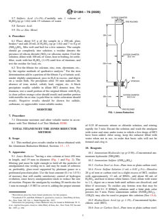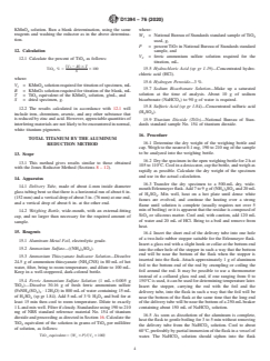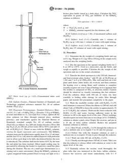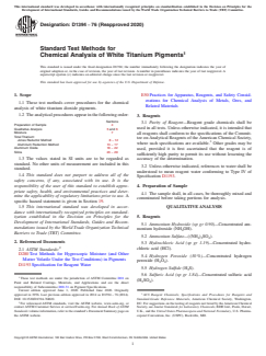 ABSTRACT These test methods cover procedures for the chemical analysis of white titanium dioxide pigments. The analytical procedures appear in the following order: sample preparation, qualitative analysis, moisture content determination, total titanium content determination by Jones Reductor and Aluminum Reduction methods, aluminum oxide content determination, and silica content determination. The reagents to be used shall include ammonium hydroxide, ammonium sulfate, hydrochloric acid, hydrogen peroxide, hydrogen sulfide, sulfuric acid, tartaric acid, tin, zinc, carbon steel, iron, ferric sulfate solution, nitric acid, sodium oxalate, potassium permanganate, aluminum metal foil, ammonium thiocyanate indicator solution, ferritic ammonium sulfate solution, sodium bicarbonate solution, sulfuric acid, titanium dioxide, acetic acid, ammonium phosphate, EDTA solution, methyl orange indicator solution, sodium bisulfate monohydrate, sodium fluoride, xylenol orange indicator solution, and zinc sulfate solution. SCOPE 1.1 These test methods cover procedures for the chemical analysis of white titanium dioxide pigments. 1.2 The analytical procedures appear in the following order: Sections Preparation of Sample 4 Qualitative Analysis 5 and 6 Moisture 7 Total Titanium: Jones Reductor Method 8 – 12 Aluminum Reduction Method 13 – 17 Aluminum Oxide 18 – 22 Silica 23 – 29 1.3 The values stated in SI units are to be regarded as standard. No other units of measurement are included in this standard. 1.4 This standard does not purport to address all of the safety concerns, if any, associated with its use. It is the responsibility of the user of this standard to establish appropriate safety, health, and environmental practices and determine the applicability of regulatory limitations prior to use. A specific hazard statement is given in Section 19. 1.5 This international standard was developed in accordance with internationally recognized principles on standardization established in the Decision on Principles for the Development of International Standards, Guides and Recommendations issued by the World Trade Organization Technical Barriers to Trade (TBT) Committee.