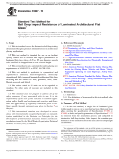 ASTM F3007-19 is a standard published by ASTM International. Its full title is "Standard Test Method for Ball Drop Impact Resistance of Laminated Architectural Flat Glass". This standard covers: SIGNIFICANCE AND USE 5.1 The impact performance of laminated glass varies with the glass ply thickness, type, and kind as well as the thickness and type of interlayer used in the overall configuration. 5.2 Specific safety properties are required for laminated glass to meet the safety glazing requirements of ANSI Z97.1 and CPSC 16 CFR 1201. Compliance with the minimum quality requirements of Specification C1172 does not constitute compliance or assure compliance with the referenced safety glazing standards. 5.3 While this test method does not replace the test requirements of ANSI Z97.1 or CPSC 16 CFR 1201 safety glazing standards addressed above, destructive ball drop impact testing does provide a method of expeditious in-plant evaluation of laminated glass products being fabricated. 5.4 Impact procedures for testing in accordance with safety glazing standards ANSI Z97.1 and CPSC 16 CFR 1201 differ from this ball drop test method; however, the penetration resistance of a single laminated lite can be determined and used for quality control purposes. SCOPE 1.1 This test method covers the destructive ball drop testing of laminated flat glass products intended for use in architectural glazing applications. 1.2 This test method is intended for use as an in-plant quality control test to evaluate the impact performance of laminated flat glass when a 2.3 kg, 83 mm diameter smooth solid steel ball is dropped from a user selected height. 1.3 This test method is not a substitute for safety glazing test requirements of ANSI Z97.1 or CPSC 16 CFR 1201. 1.4 This test method is applicable to symmetrical and asymmetrical annealed, heat-strengthened, chemically strengthened, fully tempered laminated architectural flat glass including but not limited to: float, patterned, sheet, sand-blasted, grooved, and fritted. 1.5 The values stated in SI units are to be regarded as standard. No other units of measure are included in this standard. 1.6 This standard does not purport to address all of the safety concerns, if any, associated with its use. It is the responsibility of the user of this standard to establish appropriate safety, health, and environmental practices and determine the applicability of regulatory limitations prior to use. Some specific hazards statements are given in Section 7 on Hazards. 1.7 This international standard was developed in accordance with internationally recognized principles on standardization established in the Decision on Principles for the Development of International Standards, Guides and Recommendations issued by the World Trade Organization Technical Barriers to Trade (TBT) Committee.