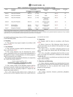 ABSTRACT This specification covers the basic physical requirements and test methods for phosphate/oil and phosphate/organic corrosion protective coatings for fasteners such as nuts, clips, washers, and other ferrous threaded and non-threaded fasteners that require corrosion protection. The zinc phosphate treatment and subsequent protective coatings are classified into seven grades according to the following requirements: Grade 0A consists of a zinc phosphate coating with no additional sealer (dry); Grade 0B consists of a zinc phosphate coating with a dry organic sealer; Grades 0C, 0D, and I consist of a zinc phosphate coating with supplemental protective oil type compound; and Grades II and III consist of a zinc phosphate with a supplemental zinc-rich epoxy resin coating (with the addition of a clear organic topcoat for Grade II). These coatings may or may not have a decorative finish. The coatings shall meet the requirements specified for appearance, adhesion, corrosion resistance, coating flexibility, thread fit, and dry-to-touch characteristics. In addition, they shall also undergo humidity and coating thickness tests. SCOPE 1.1 This specification covers the basic requirements for six grades of corrosion protection for fasteners. Grade A consists of a heavy zinc phosphate coating with no additional sealer (dry), Grade B consists of a heavy zinc phosphate coating with a dry organic sealer, Grade C consists of a heavy zinc phosphate coating with supplemental dry-to-touch oil type compound, Grade D consists of a heavy zinc phosphate coating with supplemental protective oil type compound, Grade E consists of a grain-refined microcrystalline zinc phosphate with supplemental oil type compound, and Grade F consists of a manganese phosphate coating with supplemental oil type compound. 1.2 This specification is intended primarily for fasteners such as nuts, clips, washers, and other ferrous threaded and non-threaded fasteners that require corrosion protection and lubrication. 1.3 These coatings may or may not have a decorative finish. 1.4 The values stated in either SI units or inch-pound units are to be regarded separately as standard. The values stated in each system may not be exact equivalents; therefore, each system shall be used independently of the other. Combining values from the two systems may result in non-conformance with the standard. 1.5 This international standard was developed in accordance with internationally recognized principles on standardization established in the Decision on Principles for the Development of International Standards, Guides and Recommendations issued by the World Trade Organization Technical Barriers to Trade (TBT) Committee.