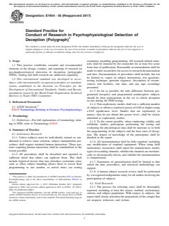 ASTM E1954-05(2017) is a standard published by ASTM International. Its full title is "Standard Practice for Conduct of Research in Psychophysiological Detection of Deception (Polygraph)". This standard covers: ABSTRACT This practice establishes essential and renumbered elements in the design, conduct, and reporting of research (both laboratory and field) on the psychophysiological detection of deception (polygraph). In laboratory research, all procedures shall be documented in sufficient detail such that others can replicate them. Subject manipulation shall require minimal human interaction; however, when human interaction is deemed necessary, such procedure shall be standardized to the extent possible. Also, when studies of exploratory nature are conducted, they shall be clearly identified as exploratory studies. In field research, on the other hand, the procedure for case selection shall be reported in sufficient detail, including the qualifications of the polygraph testing and chart evaluating participants. In cases where departures from conventional field practice are encountered, these shall be documented in sufficient detail including an explanation for the nonstandard procedures. For both laboratory and field research, statements of generalization shall be limited to those which can be supported by data, procedures, and statistical methodology. Polygraph testing shall be carried out in terms of evidentiary psychophysiological detection of deception (PDD) examinations and investigative PDD examinations, the validity and utility of which shall conform to the requirements specified. Investigative PDD examinations may resort to a "successive hurdles" approach to satisfy the minimum validity requirements. SCOPE 1.1 This practice establishes essential and recommended elements in the design, conduct, and reporting of research on psychophysiological detection of deception (polygraph) (PDD). Analog and field research are addressed separately. 1.2 This international standard was developed in accordance with internationally recognized principles on standardization established in the Decision on Principles for the Development of International Standards, Guides and Recommendations issued by the World Trade Organization Technical Barriers to Trade (TBT) Committee.