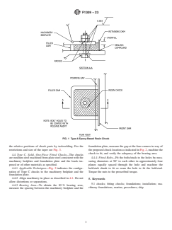 SIGNIFICANCE AND USE 3.1 This practice provides the three principal methods of fitting chocks to marine machinery foundations to ensure that the machinery is free of vibration and perfectly aligned after installation. 3.1.1 The three principal methods of installing chocks described herein are as follows: 3.1.1.1 Type A—Epoxy-based resin, nonshrinking, and 3.1.1.2 Type B—Two-piece wedge chocks. 3.1.1.3 Type C—Solid, one-piece fitted chocks. SCOPE 1.1 This practice covers the acceptable methods of fitting chocks to marine machinery foundations. 1.2 The values stated in SI units shall be regarded as standard. The values in parentheses are for information only. 1.3 This standard does not purport to address all of the safety concerns, if any, associated with its use. It is the responsibility of the user of this standard to establish appropriate safety, health, and environmental practices and determine the applicability of regulatory limitations prior to use. 1.4 This international standard was developed in accordance with internationally recognized principles on standardization established in the Decision on Principles for the Development of International Standards, Guides and Recommendations issued by the World Trade Organization Technical Barriers to Trade (TBT) Committee.