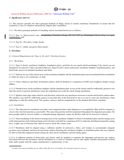 ASTM F1309-23 is a standard published by ASTM International. Its full title is "Standard Practice for Installation Procedures for Fitting Chocks to Marine Machinery Foundations". This standard covers: SIGNIFICANCE AND USE 3.1 This practice provides the three principal methods of fitting chocks to marine machinery foundations to ensure that the machinery is free of vibration and perfectly aligned after installation. 3.1.1 The three principal methods of installing chocks described herein are as follows: 3.1.1.1 Type A—Epoxy-based resin, nonshrinking, and 3.1.1.2 Type B—Two-piece wedge chocks. 3.1.1.3 Type C—Solid, one-piece fitted chocks. SCOPE 1.1 This practice covers the acceptable methods of fitting chocks to marine machinery foundations. 1.2 The values stated in SI units shall be regarded as standard. The values in parentheses are for information only. 1.3 This standard does not purport to address all of the safety concerns, if any, associated with its use. It is the responsibility of the user of this standard to establish appropriate safety, health, and environmental practices and determine the applicability of regulatory limitations prior to use. 1.4 This international standard was developed in accordance with internationally recognized principles on standardization established in the Decision on Principles for the Development of International Standards, Guides and Recommendations issued by the World Trade Organization Technical Barriers to Trade (TBT) Committee.