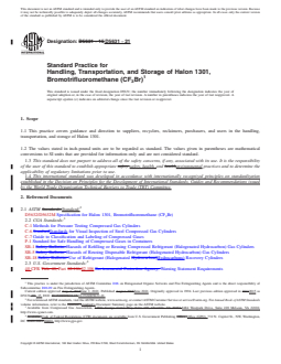 SIGNIFICANCE AND USE 4.1 This practice provides requirements for the handling, transportation, and storage of Halon 1301 encountered in distribution through both commercial and military channels. It is intended to ensure that Halon 1301 is handled, transported, and stored in such a way that its physical property values are not degraded. Transport may be by various means, such as, but not limited to, highway, rail, water, and air. SCOPE 1.1 This practice covers guidance and direction to suppliers, recyclers, reclaimers, purchasers, and users in the handling, transportation, and storage of Halon 1301. 1.2 The values stated in inch-pound units are to be regarded as standard. The values given in parentheses are mathematical conversions to SI units that are provided for information only and are not considered standard. 1.3 This standard does not purport to address all of the safety concerns, if any, associated with its use. It is the responsibility of the user of this standard to establish appropriate safety, health, and environmental practices and to determine the applicability of regulatory limitations prior to use. 1.4 This international standard was developed in accordance with internationally recognized principles on standardization established in the Decision on Principles for the Development of International Standards, Guides and Recommendations issued by the World Trade Organization Technical Barriers to Trade (TBT) Committee.