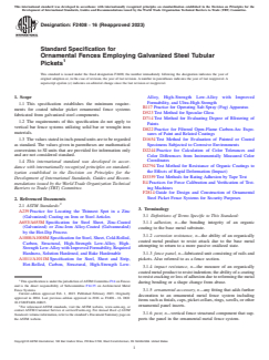 ASTM F2408-16(2023) is the Standard Specification for Ornamental Fences Employing Galvanized Steel Tubular Pickets, developed and published by ASTM International. This specification sets out the minimum performance requirements and material standards for ornamental fence systems that utilize galvanized steel tubular pickets, including their fabrication, coating, structural integrity, and component compatibility. The standard is intended to ensure durability, corrosion and weather resistance, and adequate physical security for residential, commercial, and industrial applications.