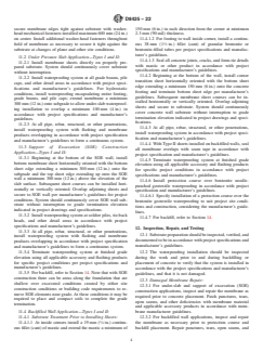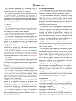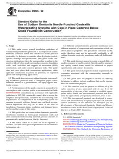 SIGNIFICANCE AND USE 5.1 This guide outlines general installation procedures and precautions for the application of sodium bentonite needle-punched geotextile waterproofing systems. 5.2 This guide is not all inclusive and is intended only to supplement detailed drawings and specifications from designers and the installation guidelines of manufacturers. Manufacturers of some of the systems addressed by this guide require proprietary products and special procedures not described in this guide. Manufacturers’ guidelines and details applicable for each site construction condition encountered on a project should therefore be considered in the application of this guide. SCOPE 1.1 This guide covers general installation guidelines of waterproofing membranes produced as a composite of sodium bentonite contained within two interlocked needle-punched geotextiles for designers to consider when developing project-specific drawings and specifications. This guide covers construction applications where the waterproofing is applied to the positive side of below-grade cast-in-place concrete foundation walls, both backfilled and support of excavation (SOE) construction, and under concrete pressure slabs. This guide does not cover plaza deck construction applications, either split-slab construction or pavers on pedestals, or vegetated green roof waterproofing applications. 1.2 This guide does not cover sodium bentonite waterproofing membranes produced with a corrugation paper carrier, bentonite bonded to a geomembrane, and spray-applied bentonite systems. 1.3 For the purpose of this guide, concrete is assumed to be cast-in-place with a surface profile as recommended in Guide D5295/D5295M, consolidated in accordance with applicable guidelines in ACI 309, structurally sound, able to accept the weight of anticipated loads, and meets the local building code requirements. All components of the waterproofing system are assumed to comply with any federal, state, and local environmental regulations that may be in effect at the time of installation. Expansion joints, insulation, and drainage layers are beyond the scope of this guide. 1.4 This guide does not cover sodium bentonite geotextile membranes installed on below-grade foundation walls and slabs constructed with masonry materials, precast concrete, or pneumatically applied concrete (that is, shotcrete). 1.5 The values stated in SI units are to be regarded as standard. The unit values given in parentheses are for reference information only. 1.6 Different sodium bentonite geotextile membranes have different materials of composition and construction which can affect physical properties. The procedures contained in this guide, therefore, may not be universally applicable to all sodium bentonite geotextile membranes under all field conditions. 1.7 This guide does not purport to assign responsibilities of quality assurance or quality control. Specific quality assurance and quality control items should be addressed in project specifications and contract documents. 1.8 This guide does not purport to include requirements for warranties associated with the waterproofing materials or installation. 1.9 This guide does not purport to include all detailing techniques to address various conditions that can be encountered on construction projects. 1.10 This standard does not purport to address all of the safety concerns, if any, associated with its use. It is the responsibility of the user of this standard to establish appropriate safety, health, and environmental practices and determine the applicability of regulatory limitations prior to use. 1.11 This international standard was developed in accordance with internationally recognized principles on standardization established in the Decision on Principles for the Development of International Standards, Guides and Recommendations issued by the World Trade Organization Technical Barriers to Trade (TBT) Committee.
