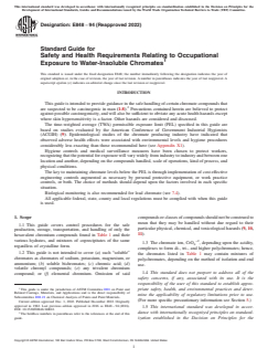 ASTM E848-94(2022), “Standard Guide for Safety and Health Requirements Relating to Occupational Exposure to Water-Insoluble Chromates,” provides essential guidance for the control of workplace hazards associated with exposure to water-insoluble chromate compounds. Developed by ASTM International, this guide specifically addresses hexavalent chromium compounds with limited water solubility, such as those found in calcium chromate and lead chromate, commonly encountered in select industrial processes.