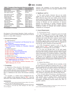 ASTM E848-94(2022) is a guide published by ASTM International. Its full title is "Standard Guide for Safety and Health Requirements Relating to Occupational Exposure to Water-Insoluble Chromates". This standard covers: SIGNIFICANCE AND USE 4.1 This guide includes chromates that are not readily soluble in water and that have water solubilities (Chromate ION) within the range of the more soluble calcium chromate and the much less soluble lead chromate. The major occupations involving potential exposure to insoluble chromates are in roasting of chromite ore, the manufacture of chromate pigments, the manufacture of coatings containing chromate pigments, and spray painting with these coatings. There is insufficient evidence to conclude that trivalent chromium compounds are carcinogenic. SCOPE 1.1 This guide covers control procedures for the safe production, storage, transportation, and handling of only the hexavalent chromium compounds found in Table 1 and their various hydrates, and mixtures of coprecipitates of the same regardless of crystalline form. 1.2 This guide is not intended to cover (a) such “soluble” chromates as chromates of sodium, potassium, magnesium, or ammonium; (b) soluble bichromates; (c) chromic acid; (d) volatile chromyl compounds; (e) any trivalent chromium compound; or (f) elemental chromium. Omission of said compounds or classes of compounds should not be construed to mean that they may be handled without due regard to their particular physical, chemical, and toxicological hazards (9, 10, 11). 1.3 The chromate ion, CrO4−2, depending upon the acidity, complexes to form di-, tri-, and higher polychromates; hence, the chromates listed in Table 1 may contain mixtures of polychromates, depending on the method of isolation and end use. 1.4 This standard does not purport to address all of the safety concerns, if any, associated with its use. It is the responsibility of the user of this standard to establish appropriate safety, health, and environmental practices and determine the applicability of regulatory limitations prior to use. (For more specific precautionary information see Section 5.) 1.5 This international standard was developed in accordance with internationally recognized principles on standardization established in the Decision on Principles for the Development of International Standards, Guides and Recommendations issued by the World Trade Organization Technical Barriers to Trade (TBT) Committee.