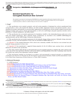 1.1 This specification covers material, geometric, and wall section properties of aluminum box culverts manufactured from corrugated plate or sheet, with attached rib stiffeners, for field assembly. Appropriate fasteners and optional materials, such as aluminum invert plates and headwalls, are also described. Applications for aluminum box culverts include conduits for gravity flow drainage of surface water, such as culverts and storm drains, as well as for small bridges and grade separation structures such as pedestrian or vehicular underpasses, and utility tunnels.
