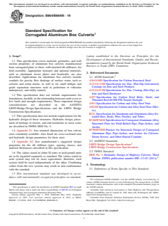 ASTM B864/B864M-19 is a technical specification published by ASTM International. Its full title is "Standard Specification for Corrugated Aluminum Box Culverts". This standard covers: ABSTRACT This specification covers the requirements for material, geometric, and wall section properties of aluminum box culverts manufactured from corrugated plate or sheet with attached rib stiffeners, for field assembly. Suitable fasteners and optional materials such as aluminum invert plates and headwalls are also described here. Material applications include surface water gravity flow drainage conduits like culverts and storm drains, small bridge, and grade separation structure conduits like pedestrian or vehicular underpasses, and utility tunnels. This specification does not cover the requirements for foundations, backfill, the relationship between earth cover or live loads and strength requirements, or the hydraulic design of these structures. The required plastic moment capacities should be determined for both the crown and haunch segments of the box culverts. SCOPE 1.1 This specification covers material, geometric, and wall section properties of aluminum box culverts manufactured from corrugated plate or sheet, with attached rib stiffeners, for field assembly. Appropriate fasteners and optional materials, such as aluminum invert plates and headwalls, are also described. Applications for aluminum box culverts include conduits for gravity flow drainage of surface water, such as culverts and storm drains, as well as for small bridges and grade separation structures such as pedestrian or vehicular underpasses, and utility tunnels. 1.2 This specification does not include requirements for foundations, backfill, or the relationship between earth cover or live loads and strength requirements. These important design considerations are described in the AASHTO LRFD Bridge Design Specifications and the LRFD Bridge Construction Specifications. 1.3 This specification does not include requirements for the hydraulic design of these structures. Hydraulic design, placement of footings or inverts, and end treatments to resist scour are described in FHWA HDS No. 5. 1.4 Appendix X1 lists nominal dimensions of box culvert sizes commonly available. Also listed are cross-sectional area and hydraulic design parameters for these sizes. 1.5 Appendix X2 lists manufacturer's suggested design properties for the rib stiffener types, spacing classes, and material thicknesses described in this specification. 1.6 The values stated in either SI units or inch-pound units are to be regarded separately as standard. The values stated in each system may not be exact equivalents; therefore, each system shall be used independently of the other. Combining values from the two systems may result in non-conformance with the standard. 1.7 This international standard was developed in accordance with internationally recognized principles on standardization established in the Decision on Principles for the Development of International Standards, Guides and Recommendations issued by the World Trade Organization Technical Barriers to Trade (TBT) Committee.