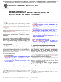 ASTM A1049/A1049M-18(2023) is a technical specification published by ASTM International. Its full title is "Standard Specification for Stainless Steel Forgings, Ferritic/Austenitic (Duplex), for Pressure Vessels and Related Components". This standard covers: ABSTRACT This specification covers ferritic/austenitic (duplex) stainless steel forgings for boilers, pressure vessels, and associated equipment. The steels shall be manufactured using melting and forging processes. Forgings may be machined before solution annealing. The forgings shall undergo tension and hardness tests. Also, they shall be subjected to a non-destructive examination by ultrasonic inspection. SCOPE 1.1 This specification covers ferritic/austenitic (duplex) stainless steel forgings for boilers, pressure vessels, and associated equipment in grades that are also found in Specification A182/A182M. 1.2 The purchaser may specify in the order or contract any appropriate supplementary requirements that are provided in Specification A788/A788M. 1.3 Unless the order specifies the applicable “M” specification designation the material shall be furnished to the inch-pound units. 1.4 The values stated in either inch-pound or SI (metric) units are to be regarded separately as standard. Within the text and tables, the SI units are shown in brackets. The values stated in each system may not be exact equivalents; therefore, each system shall be used independently of the other. Combining values from the two systems may result in nonconformance with the specification. 1.5 This international standard was developed in accordance with internationally recognized principles on standardization established in the Decision on Principles for the Development of International Standards, Guides and Recommendations issued by the World Trade Organization Technical Barriers to Trade (TBT) Committee.