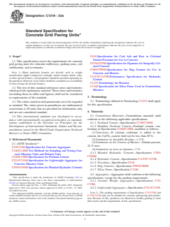 ASTM C1319-23a is a technical specification published by ASTM International. Its full title is "Standard Specification for Concrete Grid Paving Units". This standard covers: ABSTRACT This specification covers the requirements for concrete grid paving units proposed for use in vehicular trafficways, parking areas, soil stabilization, and revetments. Materials shall possess adequate durability for the intended use. SCOPE 1.1 This specification covers the requirements for concrete grid paving units for vehicular trafficways, parking areas, soil stabilization, and revetments. Note 1: When particular features are desired, such as weight classification, higher compressive strength, surface texture, finish, color, or other special features, such properties should be specified separately by the purchaser. However, local sellers should be consulted as to availability of units having the desired features. 1.2 The text of this standard references notes and footnotes which provide explanatory material. These notes and footnotes (excluding those in tables and figures) shall not be considered as requirements of the standard. 1.3 The values stated in inch-pound units are to be regarded as standard. The values given in parentheses are mathematical conversions to SI units that are provided for information only and are not considered standard. 1.4 This international standard was developed in accordance with internationally recognized principles on standardization established in the Decision on Principles for the Development of International Standards, Guides and Recommendations issued by the World Trade Organization Technical Barriers to Trade (TBT) Committee.